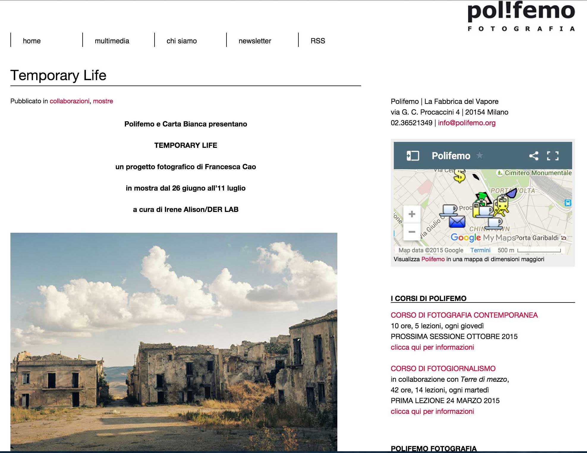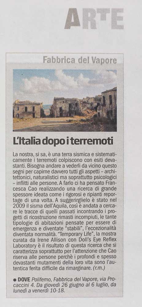 At the moment she’s working on the project called “Temporary Life”, that is a travel through Italy documenting the areas where the reconstruction after the earthquakes that happened in the 1900’s wasn’t accomplished, so that the wounds are still visible. In 2013 the dummy book of this body of work , called “Temporary Life” was finalist at the Unseen Dummy Award in Amsterdam. Temporary Life is now a book project in collaboration with Postcart.