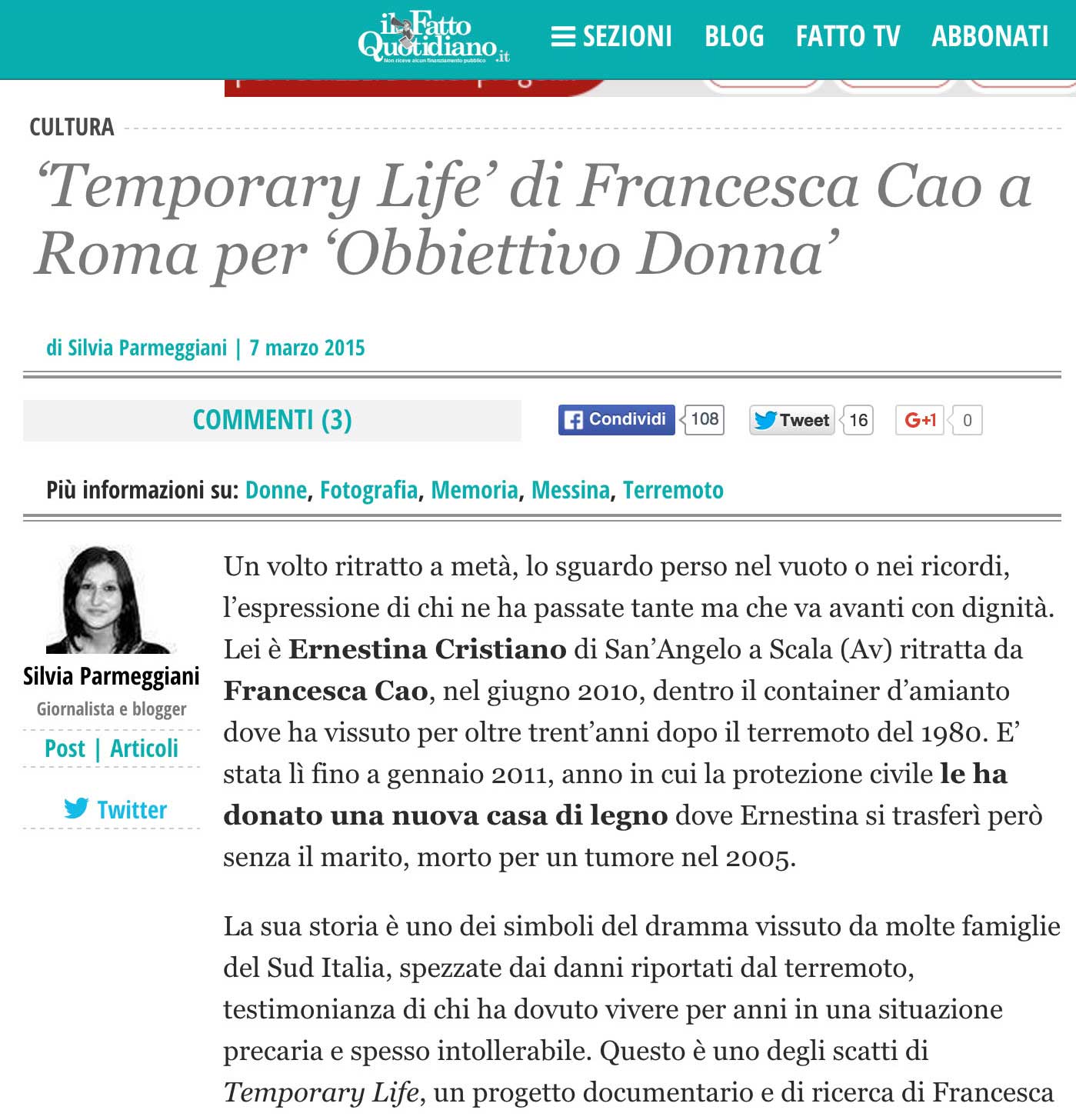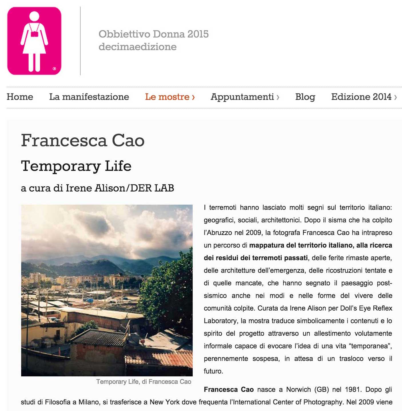 In 2011 the story of Ernestina, a woman that has been living in an asbestos temporary house for thirty years as a consequence of the 1980 Irpinia earthquake, becomes an exhibition along with the pictures of the photographer Michela Palermo, called My Broken World, that travels through Milan, Rome, Rimini, Avellino, Foiano Fotografia festival and Bisaccia. In the same year starts working on the book project for her work “The Lion of Central Asia”.