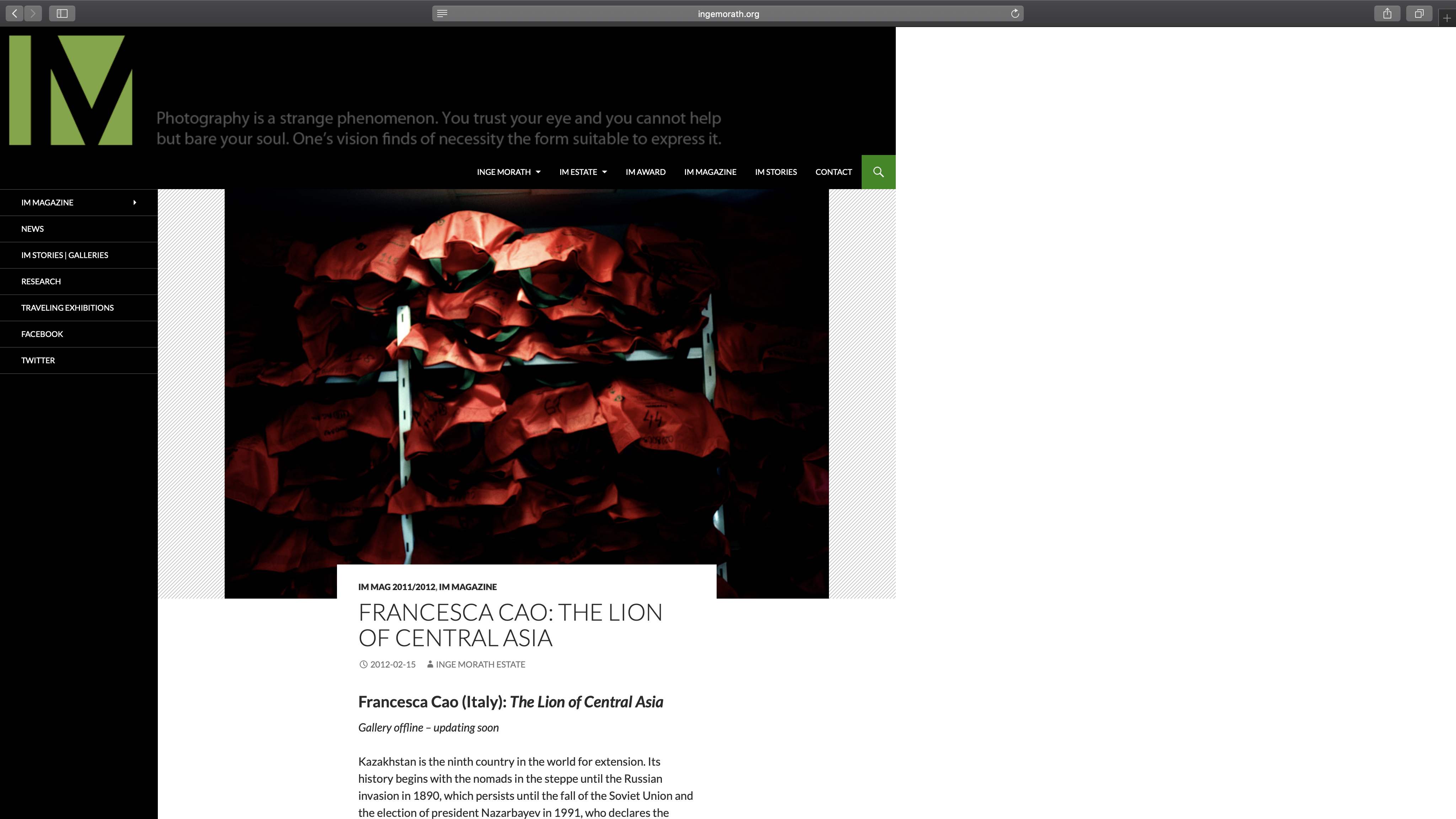 In 2012 the project The Lion of Central Asia is selected for the Inge Morath award.